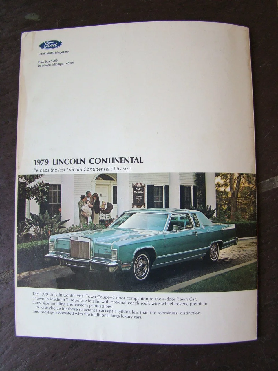 Continental Magazine was Lincoln’s official publication that was sent to owner’s of Lincoln automobiles. In this special edition the Collector’s Series automobiles were introduced the magazines patrons in Fall 1978. The Collector’s Series marked the end of an era for the traditional full sized American luxury automobile. A letter from Lincoln Mercury Vice President and General Manager Walt Oben was also included.