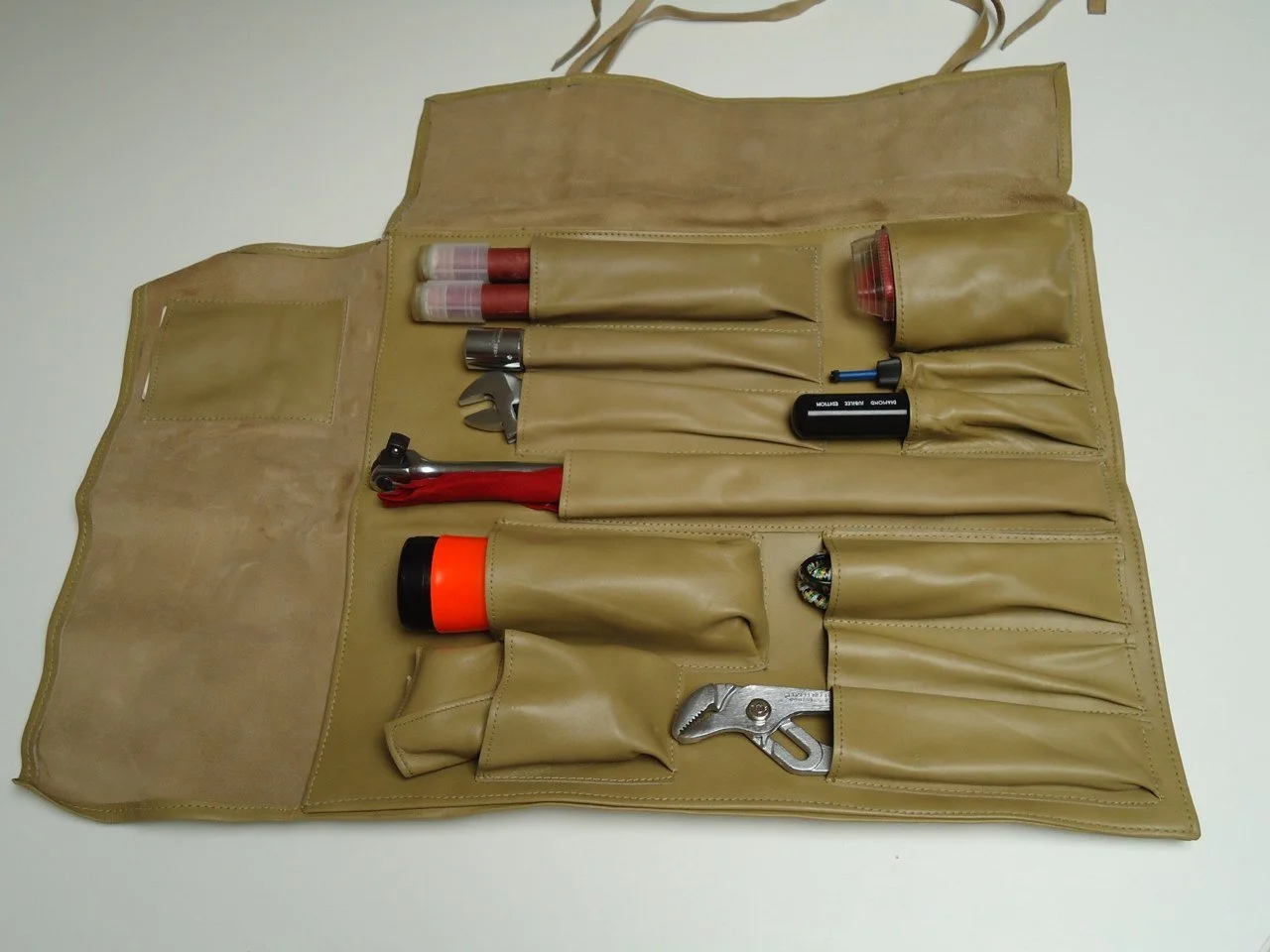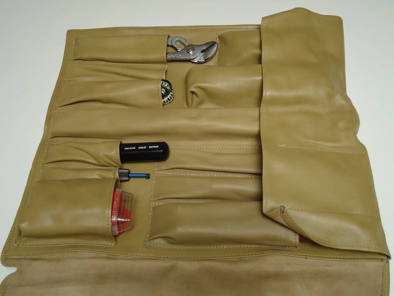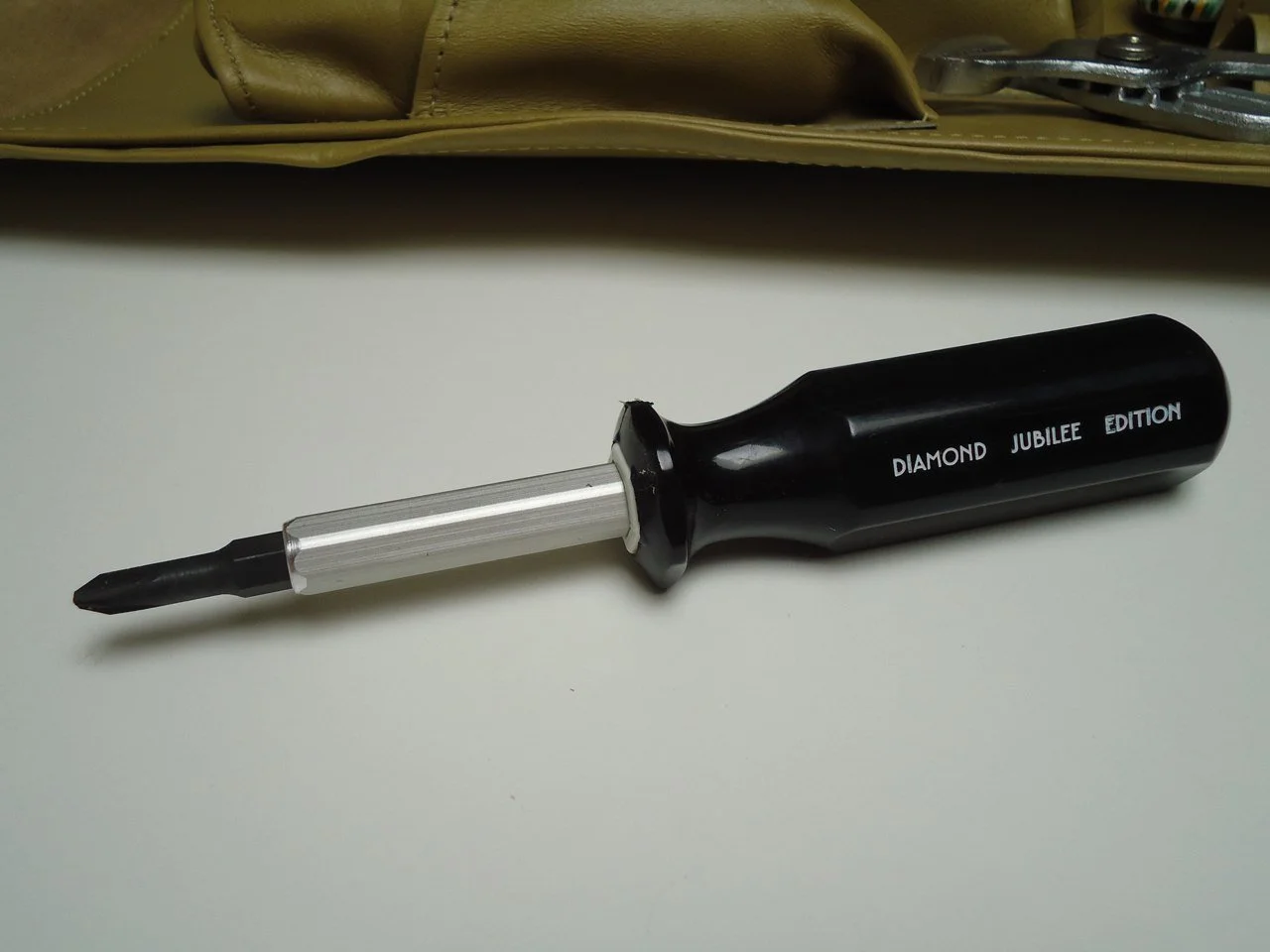 Every 1978 Continental Mark V Diamond Jubilee Edition car came equipped with a high quality leather tool kit manufactured by the fabled Wright Tool Company for Lincoln. The kits came complete with a bulb pack, flash light and emergency flares just to name a few. The flashlight was manufactured by Bright Star Company which was the original manufacturer of flashlights. Bright Star produced flash lights still used by the U.S. Military today. The flashlight and reversible multi use screwdriver were engraved with the Diamond Jubilee Edition name.